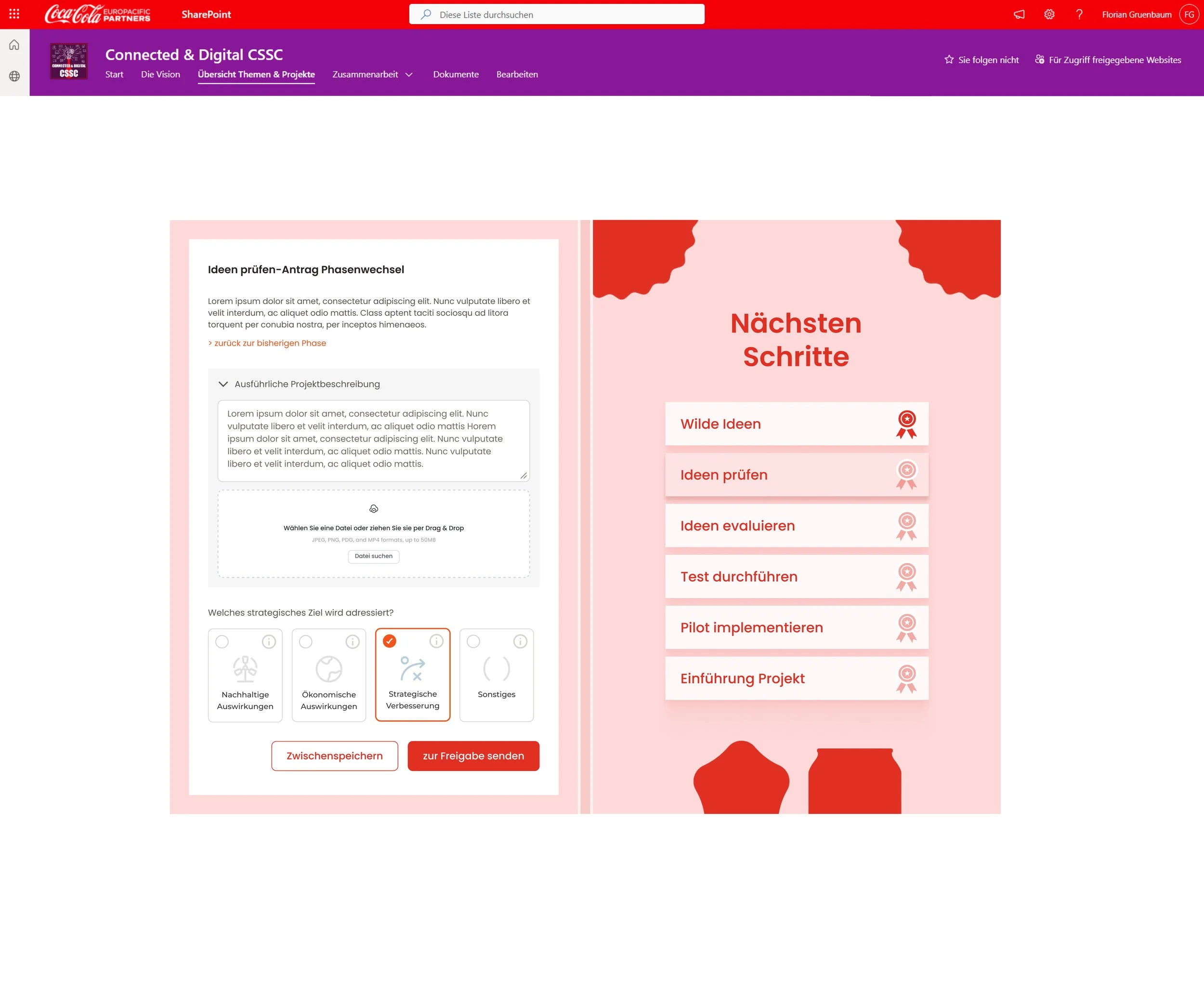 Als CCEP-Mitarbeiter habe ich die Möglichkeit, über das Portfoliomanagement-Portal eine Idee einzureichen, die CCEP einen Mehrwert bietet. Dadurch werde ich zum Antragsteller.