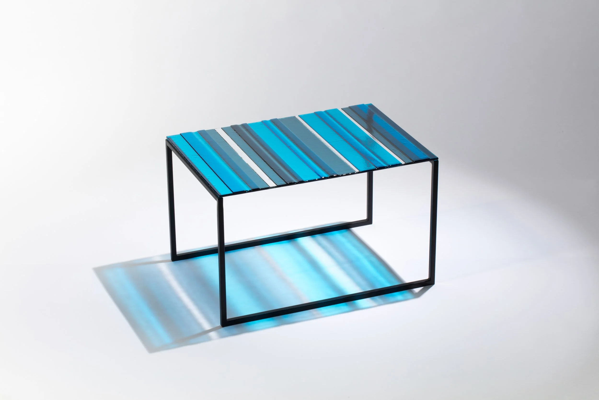 "August" ist ein Beistelltisch aus Glas und Metall mit einer Tischplatte aus rechteckigen Glasstreifen, die durch Glasfusing zu einem geometrischen Muster verschmolzen wurden. Die schichtweise Anordnung der Streifen erzeugt eine flache, leicht wellenförmige Silhouette mit sanft gerundeten Kanten, die dem Glas eine besondere Haptik verleiht. Die durchscheinenden blauen Streifen werfen farbige Schatten und erzeugen subtile Zwischentöne.